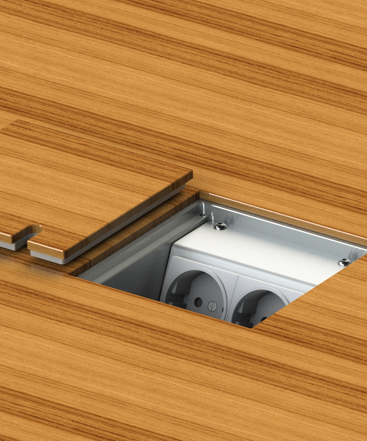 Golvbox 8802B är tillverkad i aluminium, har lock för trä/sten som är justerbart i höjd. Plats för 2 uttag.