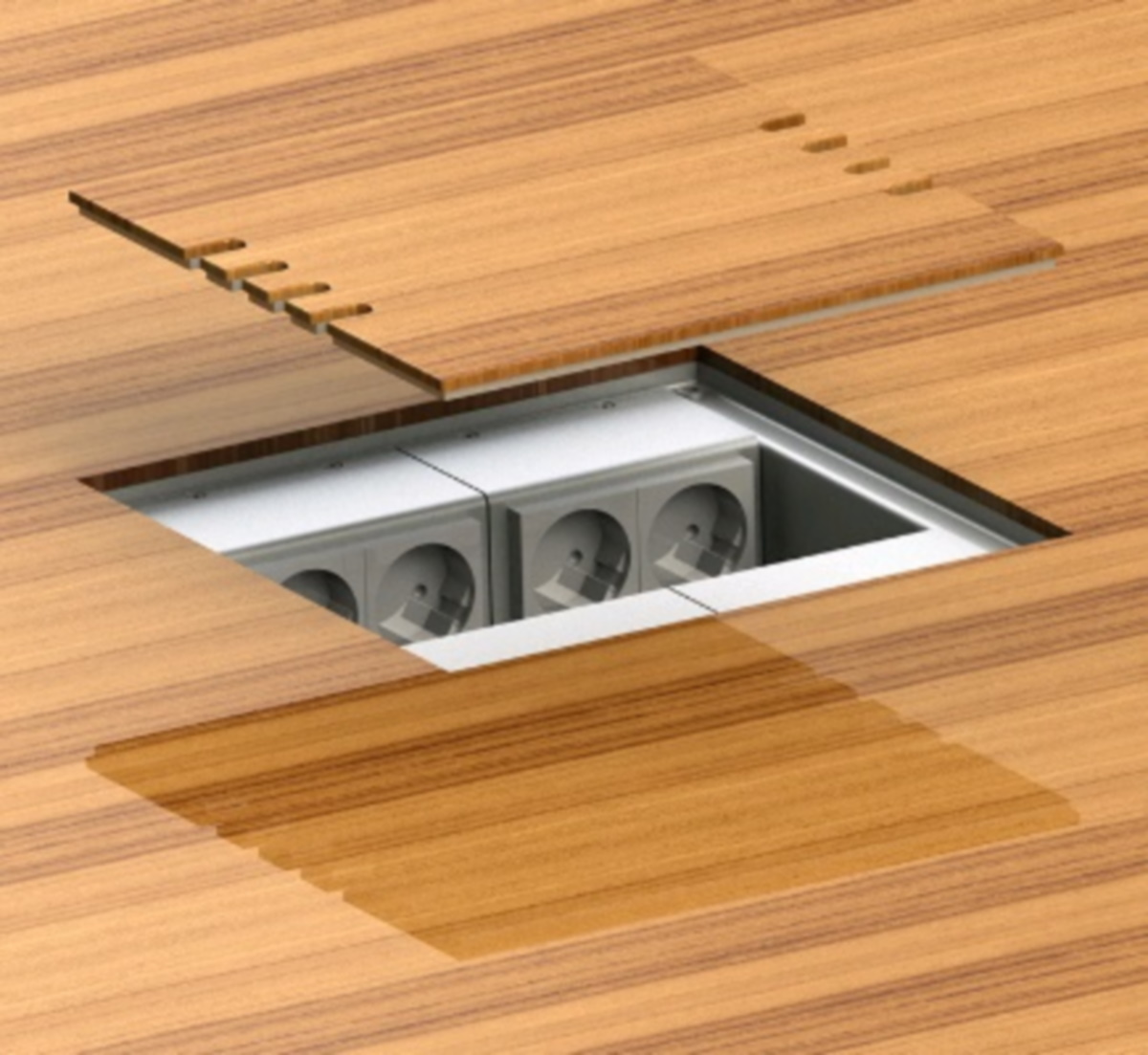 Golvbox 8808B är tillverkad i aluminium, har lock för trä/sten som är justerbart i höjd. Plats för 8 uttag.