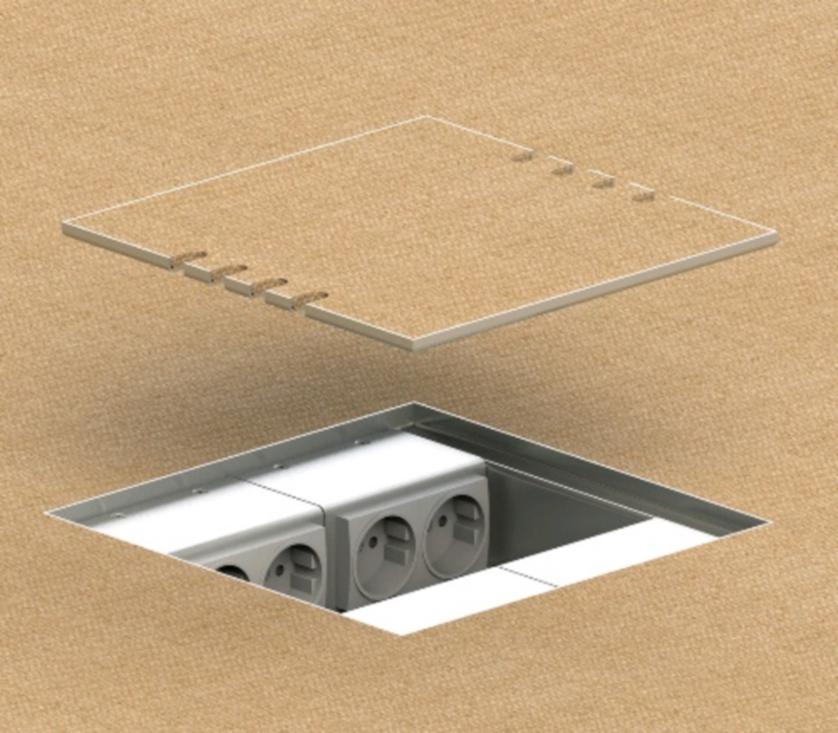 Golvbox 8808T är tillverkad i aluminium, har lock i rf stål för 6mm golvmaterial, justerbart i höjd. Plats för 8 uttag.