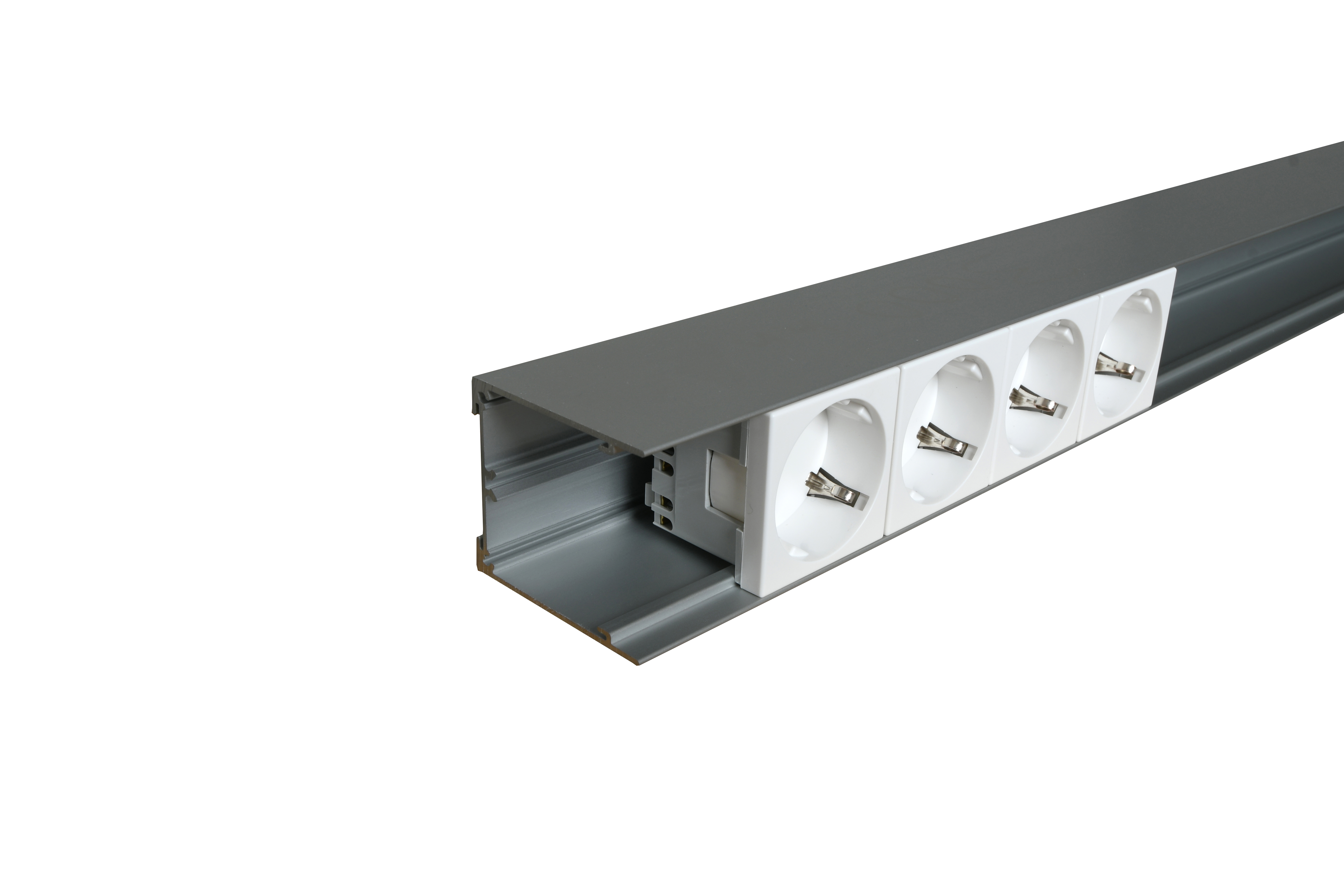 V50 är en mycket smal aluminiumkanal som passar lika bra som nedföringskanal, uttagslist, lab panel, väggstav eller som bordsbox.
