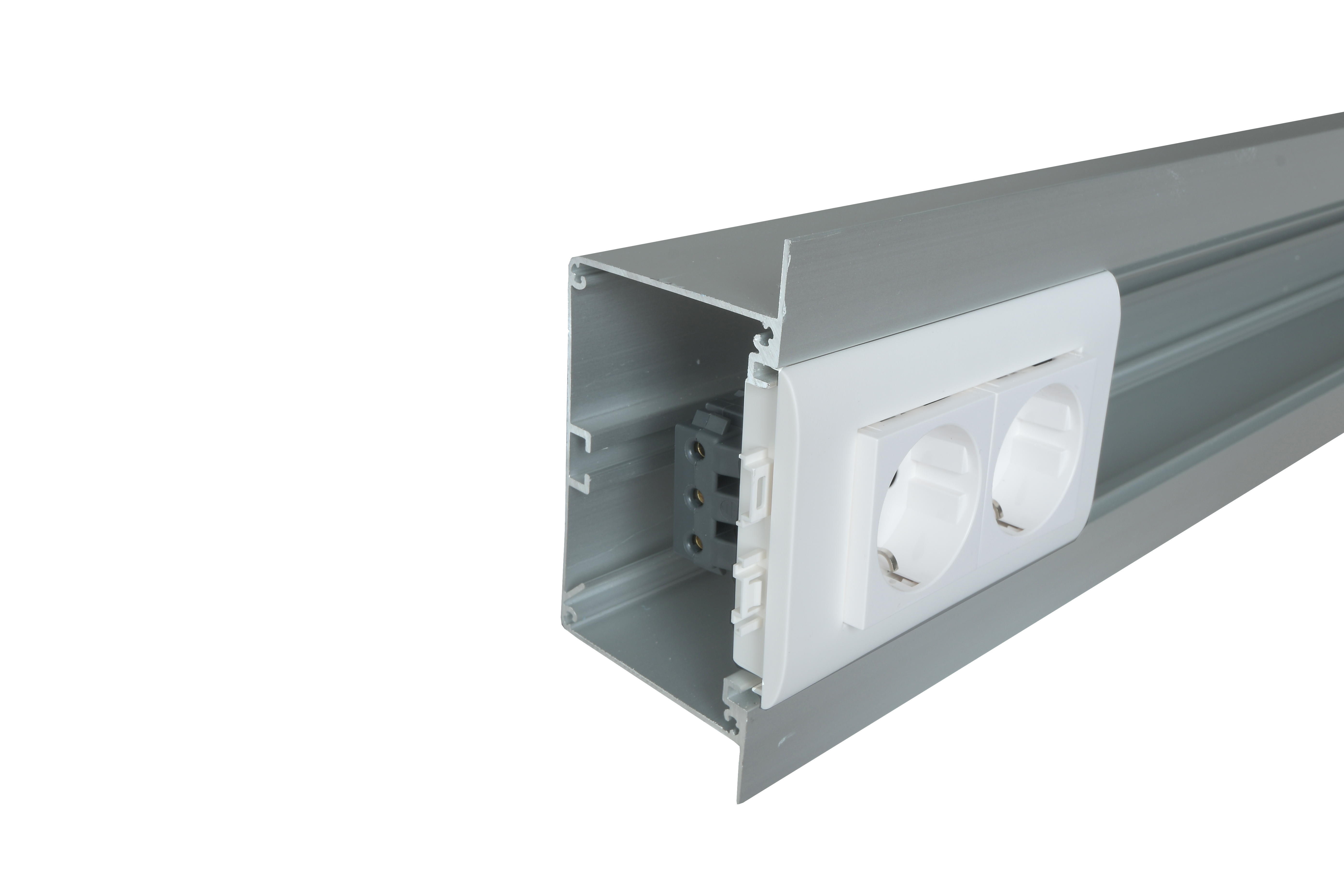 V125 är en diskret aluminiumkanal som passar lika bra som fönsterbänkskanal, nedföringskanal, uttagslist, lab panel eller väggstav.