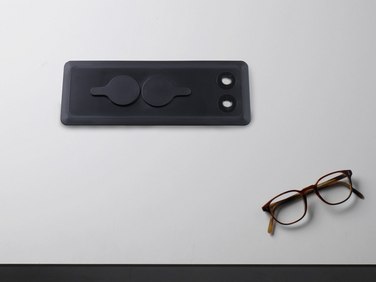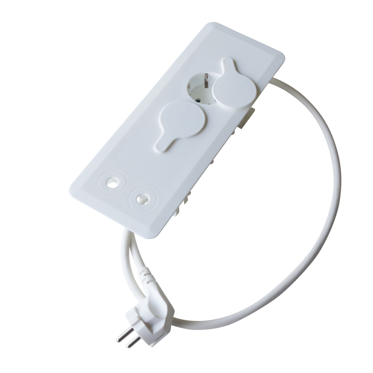 Ren design med mjuka kanter och två eluttag som döljs av lock när de inte används.