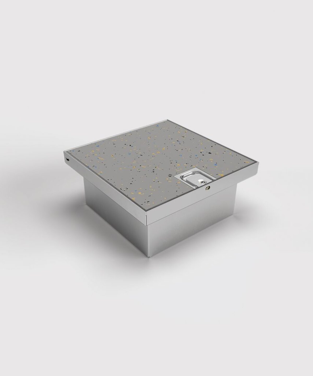Golvbox 2003B, rostfritt stål, lock med plats för 15mm golvmaterial. 1 fack för 3 uttag.