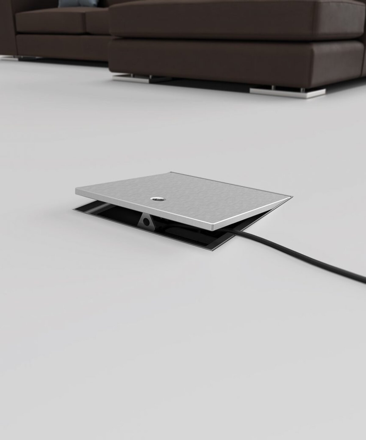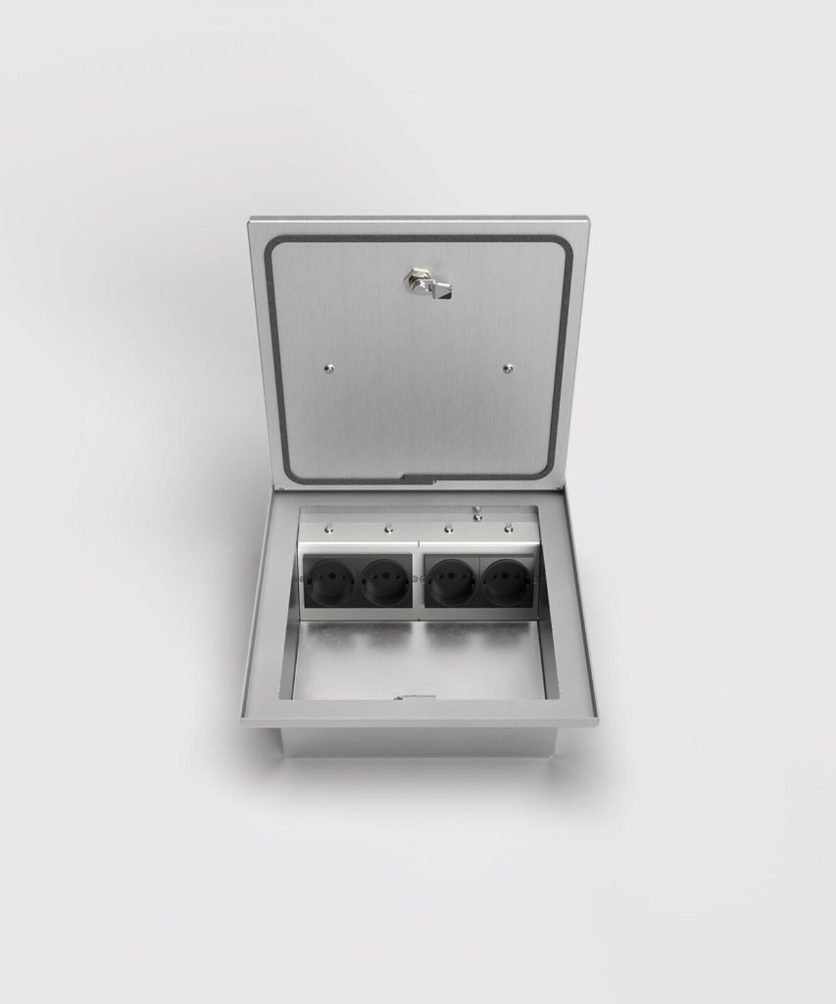 Golvbox 2004A, rostfritt stål, slätt lock i eloxerad aluminium. 1 fack för 4 uttag.