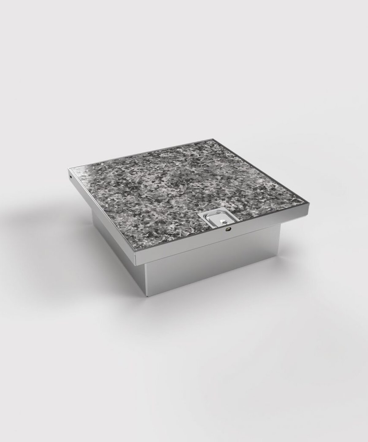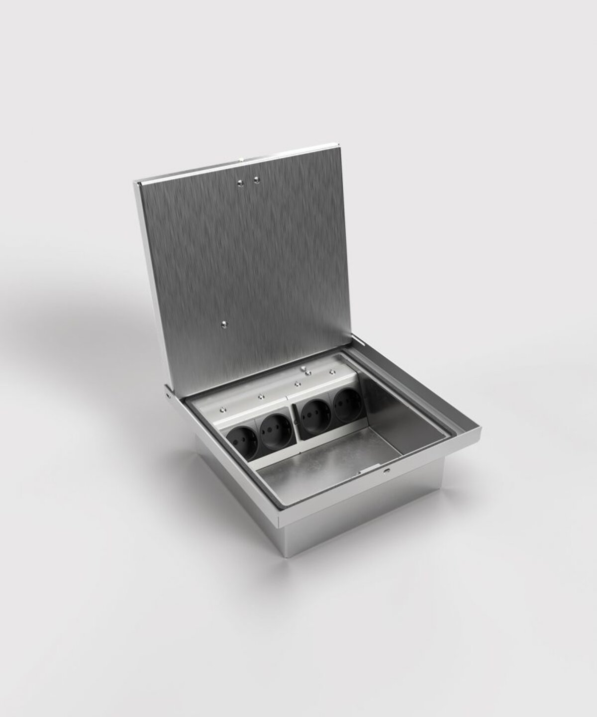Golvbox 2004B, rostfritt stål, lock med plats för 15mm golvmaterial. 1 fack för 4 uttag.