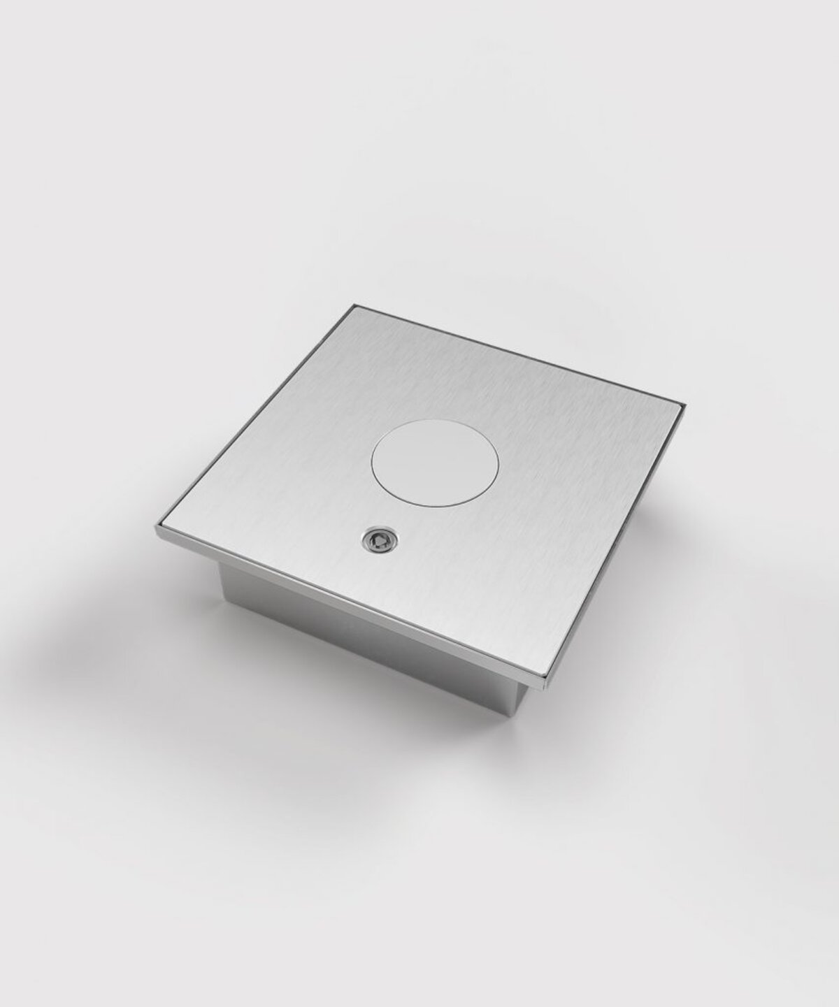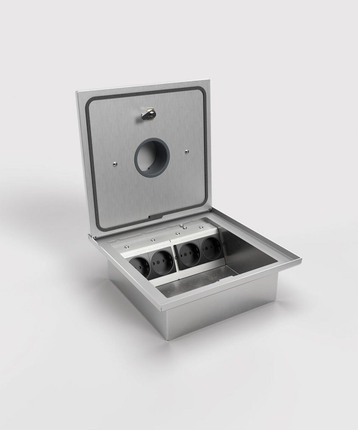 Golvbox 2004Q, rostfritt stål, slätt låsbart lock i elox alu med centrumutlopp. 1 fack för 4 uttag.