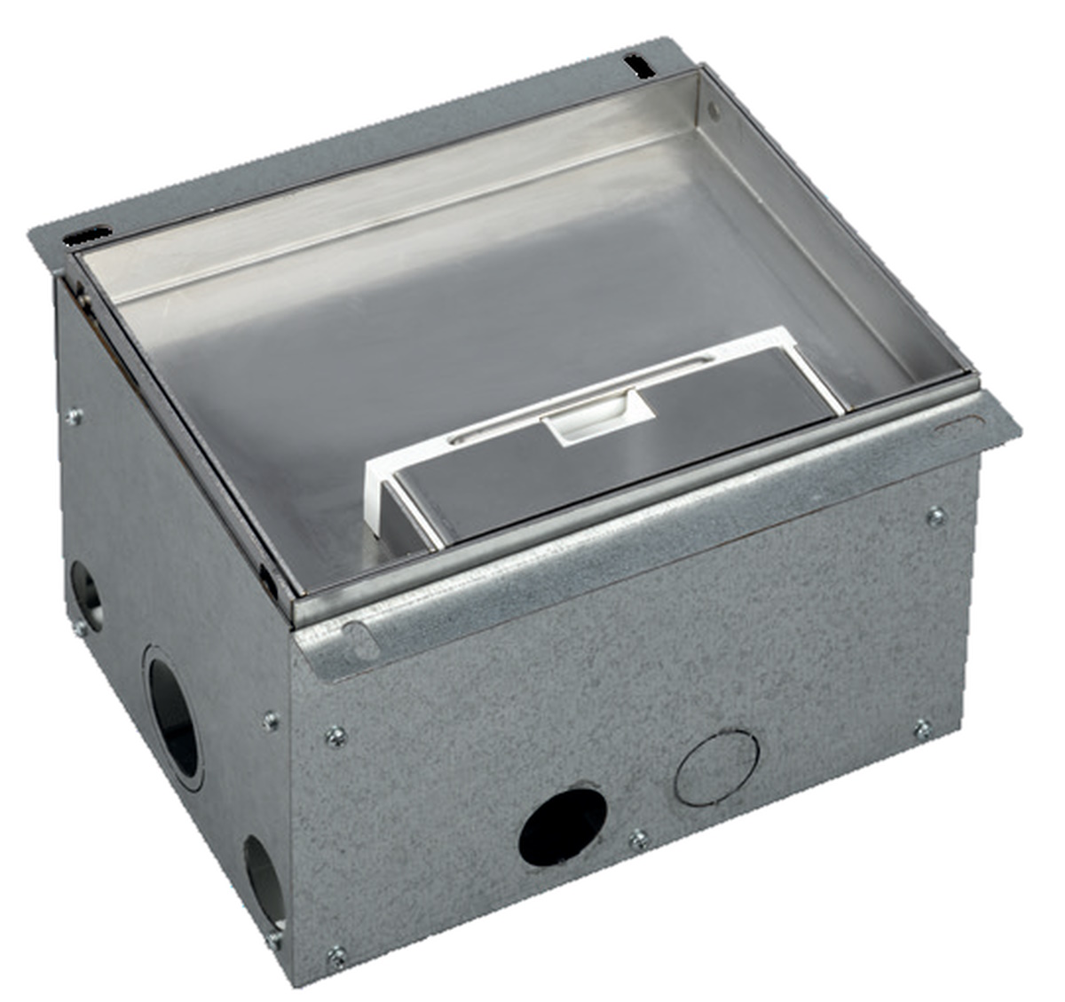 Golvbox Standard Stål överdel är tillverkad i rostfritt stål med plats för 20mm golvmaterial, 3 fack Plats för 6 uttag.
