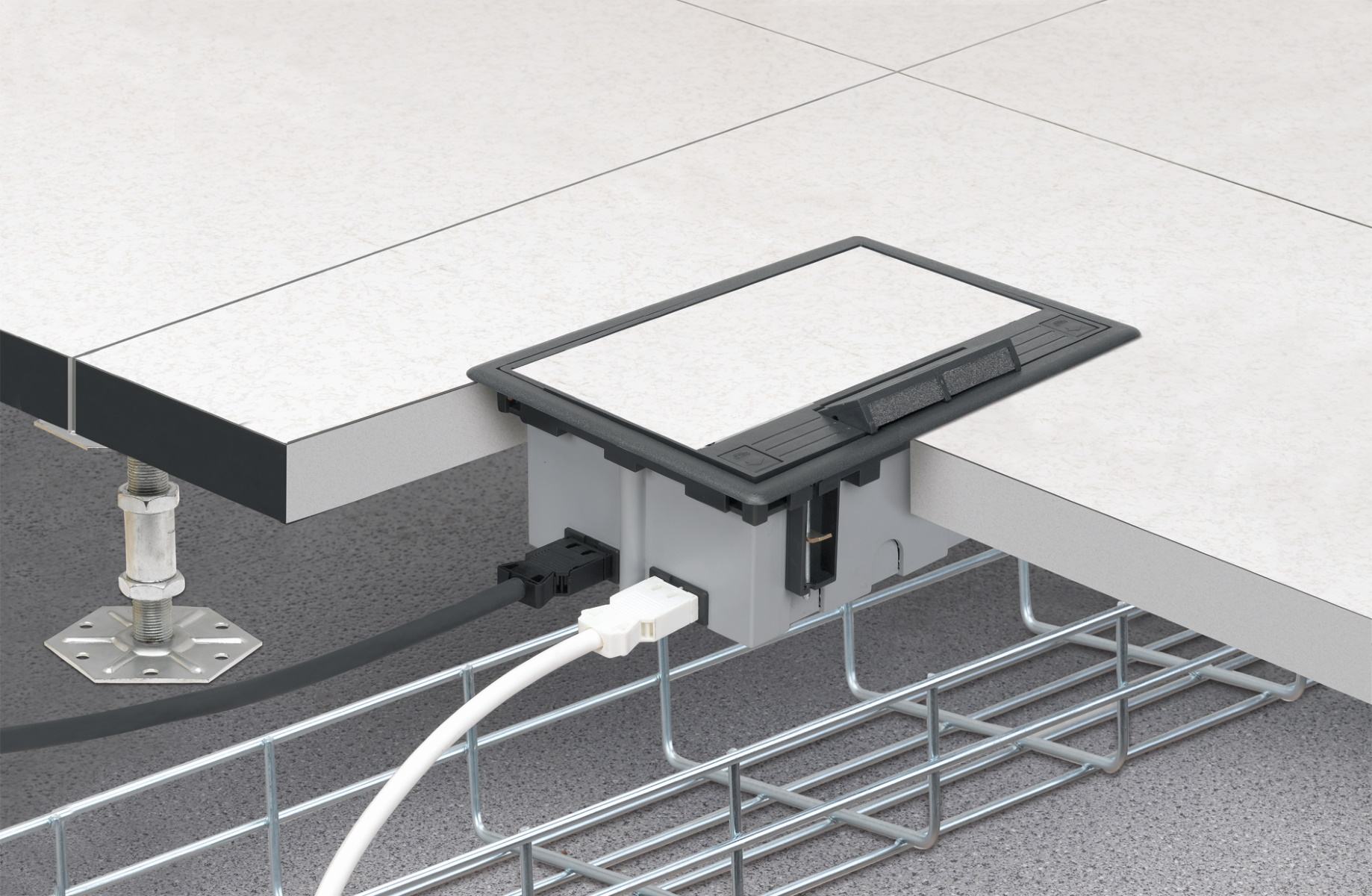 Golvbox för installationsgolv, hålrumsbjälklag, reglade eller gjutna golv. Boxarna bestyckas med enkla eller dubbla snabbanslutnings uttag och/eller data och mediauttag samt automatsäkring och jordfelsbrytare. Justerbart djup 90-10mm. Denna djupare box är främst avsedd för data/installations golv