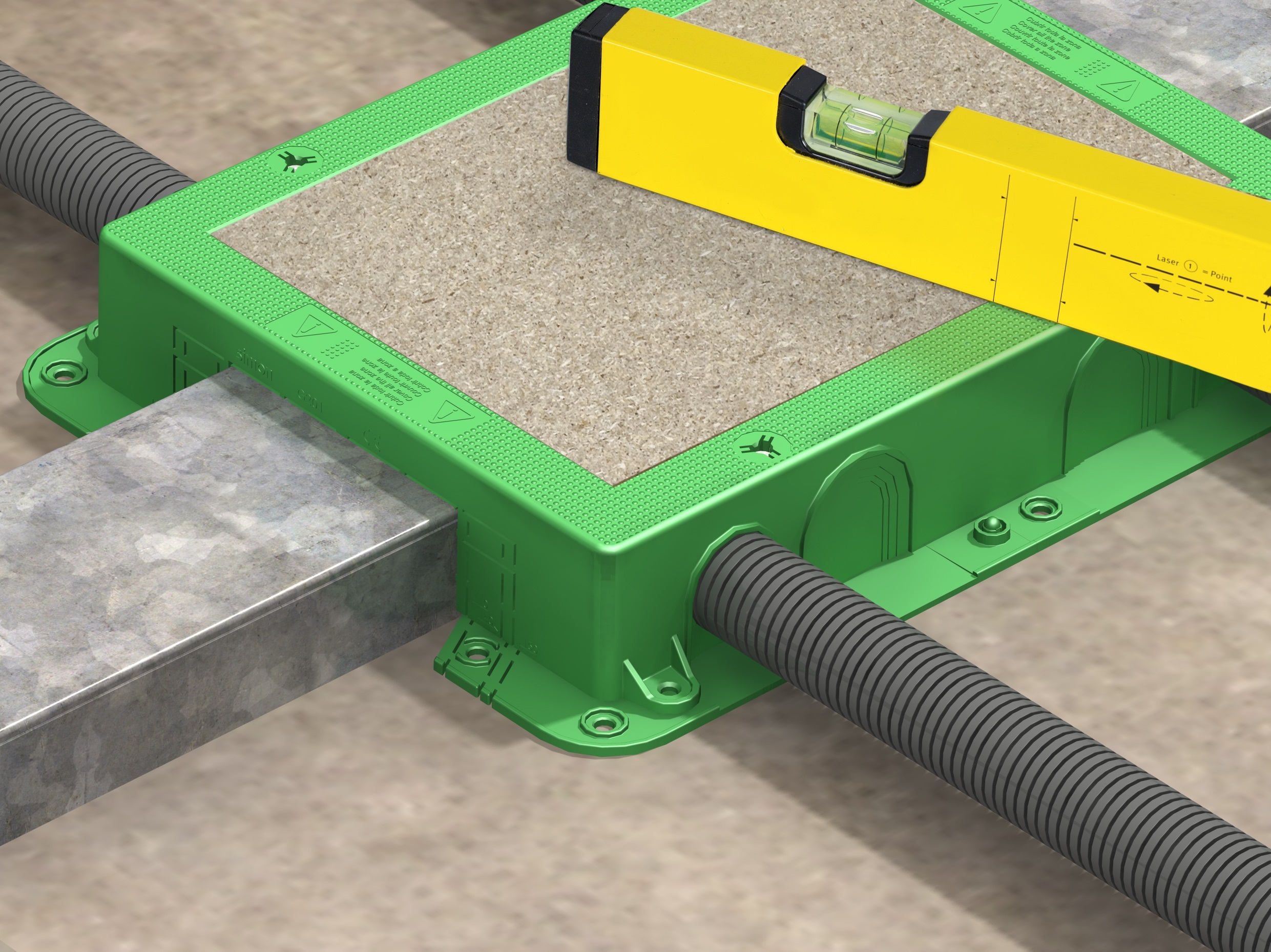 Ingjutningsboxen som saknar botten är endast avsedd för ingjutning, och det färdiga golvet, min tjocklek 11mm, måste gå hela vägen till ingjutningsboxens hål.