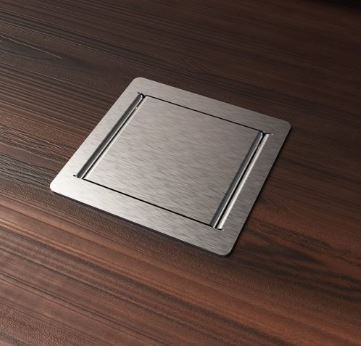 Lock av gångjärnsmodell för enkelt och bekvämt handhavande med uttagen placerade lättåtkomligt därunder, lock och ram i rostfritt stålfinish.