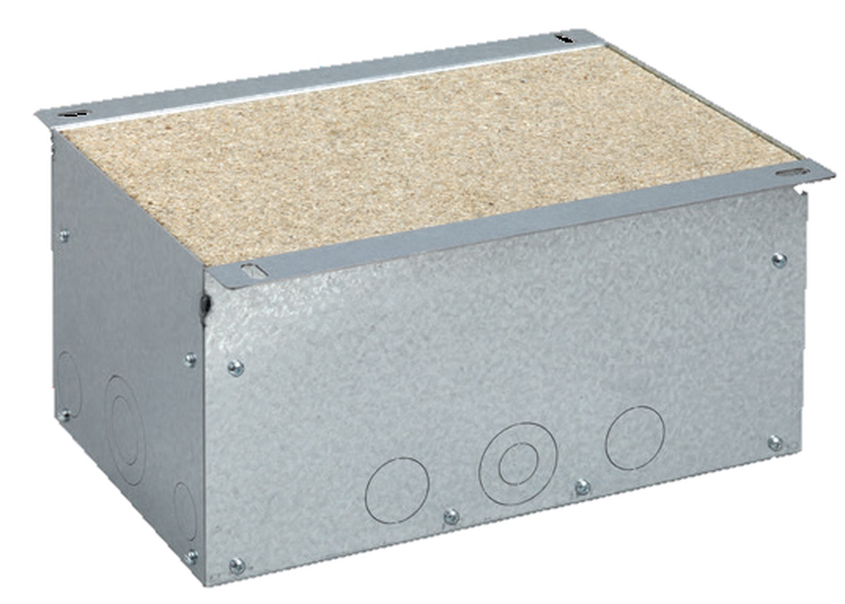 Ingjutningsbox, 3 fack, i galv stål med knockouts på alla 4 sidor. Levereras med skyddande trälock för enkel ingjutning.